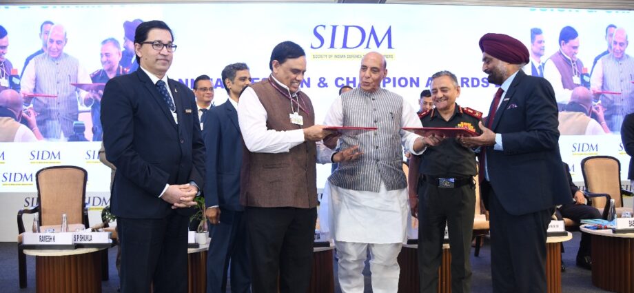 नई दिल्ली, 4 अक्टूबर (हि.स.)। अखिल भारतीय तकनीकी शिक्षा परिषद (एआईसीटीई) और सोसाइटी ऑफ इंडियन डिफेंस मैन्युफैक्चरर्स (एसआईडीएम) के बीच शुक्रवार को ताजमहल होटल में आयोजित कार्यक्रम में ऐतिहासिक समझौता ज्ञापन (एमओयू) का आदान-प्रदान किया गया। इस मौके पर रक्षामंत्री राजनाथ सिंह, एआईसीटीई के अध्यक्ष प्रो. टीजी सीताराम और एसआईडीएम के अध्यक्ष डॉ. राजिंदर सिंह भाटिया उपस्थित थे।